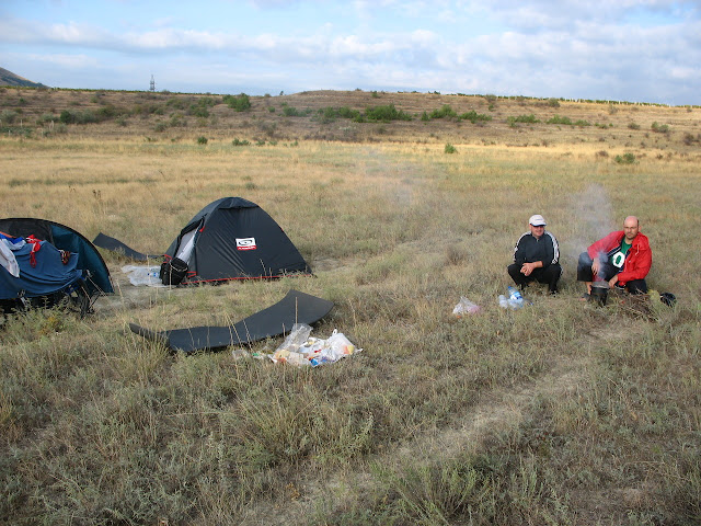 Прокинулися ми рано, не було і 6 години. Було прохолодно і дув страшенний вітер. Думку про приготування їжі на пічці на вулиці я відкинув одразу, тим паче що у мене були варіанти - на додаток до пічки я узяв пальник. На пальникові у наметі ми швиденько закип'ятили воду і залили гречку - хай запарюється. Паралельно почали збиратися. До того часу, коли сніданок був готовий ми майже зібрали табір. Сіли снідати і поставили воду на чай. Після сніданку настрій трохи піднявся. Сергій усе питав чи будемо ми зупинятися на піщаному пляжу, який бачили учора для купання. Я вирішив що при такому вітрі купатися ми (я і Наталка) не будемо. Тоді Сергій вирішив втілити мрію про купання у Азовському морі самотужки поки ми будемо збиратися.