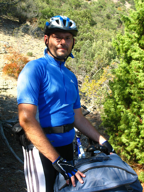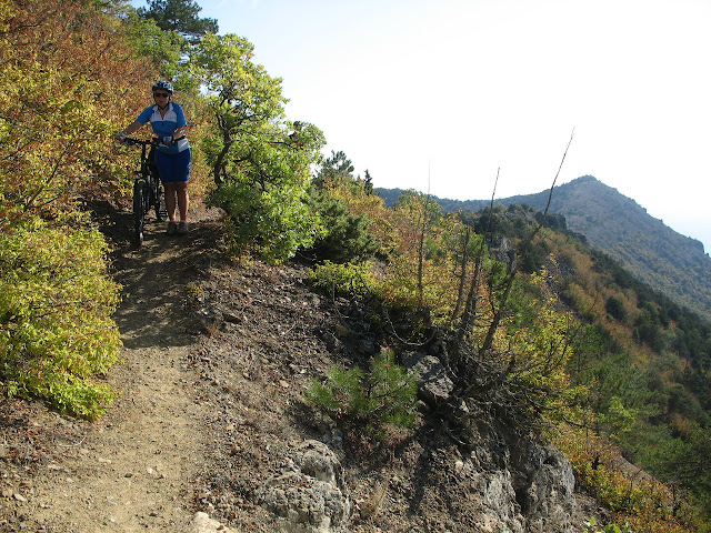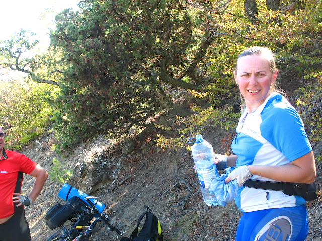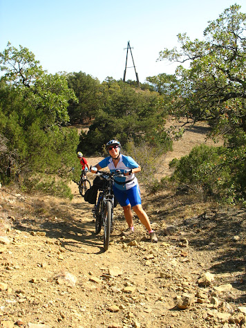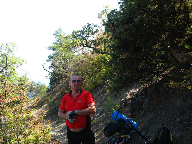 І знову я "дав у штангу": по маршруту після спуску з гори ми перетинали дорогу з Кутлакської бухти до с. Веселе і рухалися до перетину із трасою Судак - Морське. Все було б добре за виключенням одного - за 50 м. до перетину тієї дороги із трасою вона закінчилася і до траси залишився підйом просто по горі з перепадом висоти теж метрів 60-80. Так, я бігав-шукав стежку, потім намагався знайти варіанти підйому. Іще й навігатор мій вмер (злетіла firmware). Коротше кажучи годину часу ми просто втратили, а потім повернулися до того самого роздоріжжя і рушили дорогою на с. Веселе. 2+2 = 4 км дарма крутили педалі.