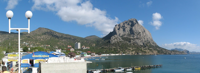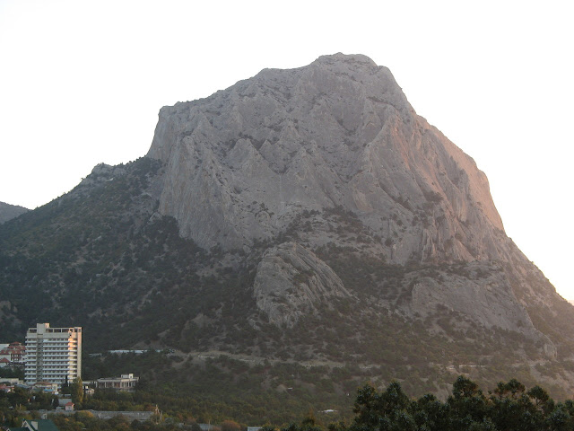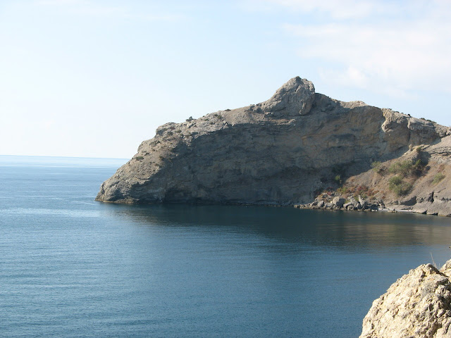 Вид на мис Капчик (гора-дельфін) з боку Нового Світу - обрис гори здалеку нагадує пірнаючого дельфіна: