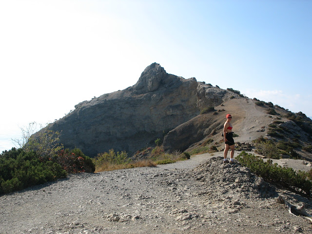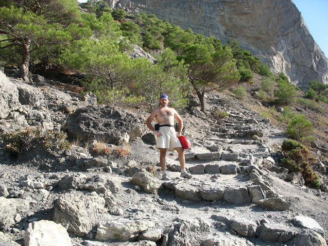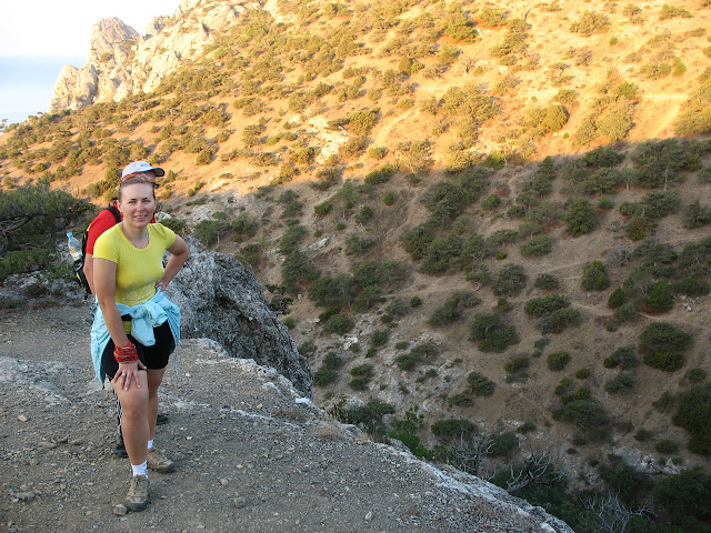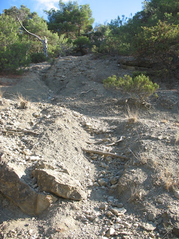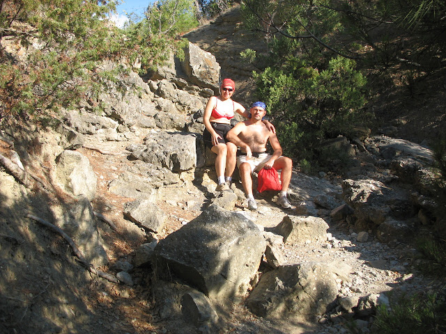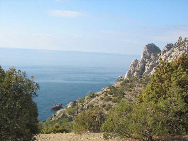 Нарешті пройшовши у зворотньому напрямку від миса Капчик у гори ми зупинилися біля паркану турбази. Недовгий спуск вздовж нього до ущелини, і вже звідти ми вийшли на стежку до самого пляжу:
