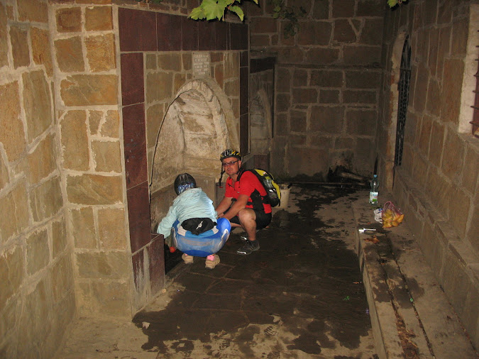 Щоби зекономити час Наталка і я поїхали до кінця вулиці - на ринок. Поки Наталка стояла з велосипедами, я купив і помив кавуна до 10 кг. З кавуном і завантаженим баулом я їхати не міг. Тому постоявши іще трохи я домовився що Наталка почекає на Сергія, а я поки-що рушу пішки до цвинтаря. Від нього починається наш підйом на гору вздовж труби.